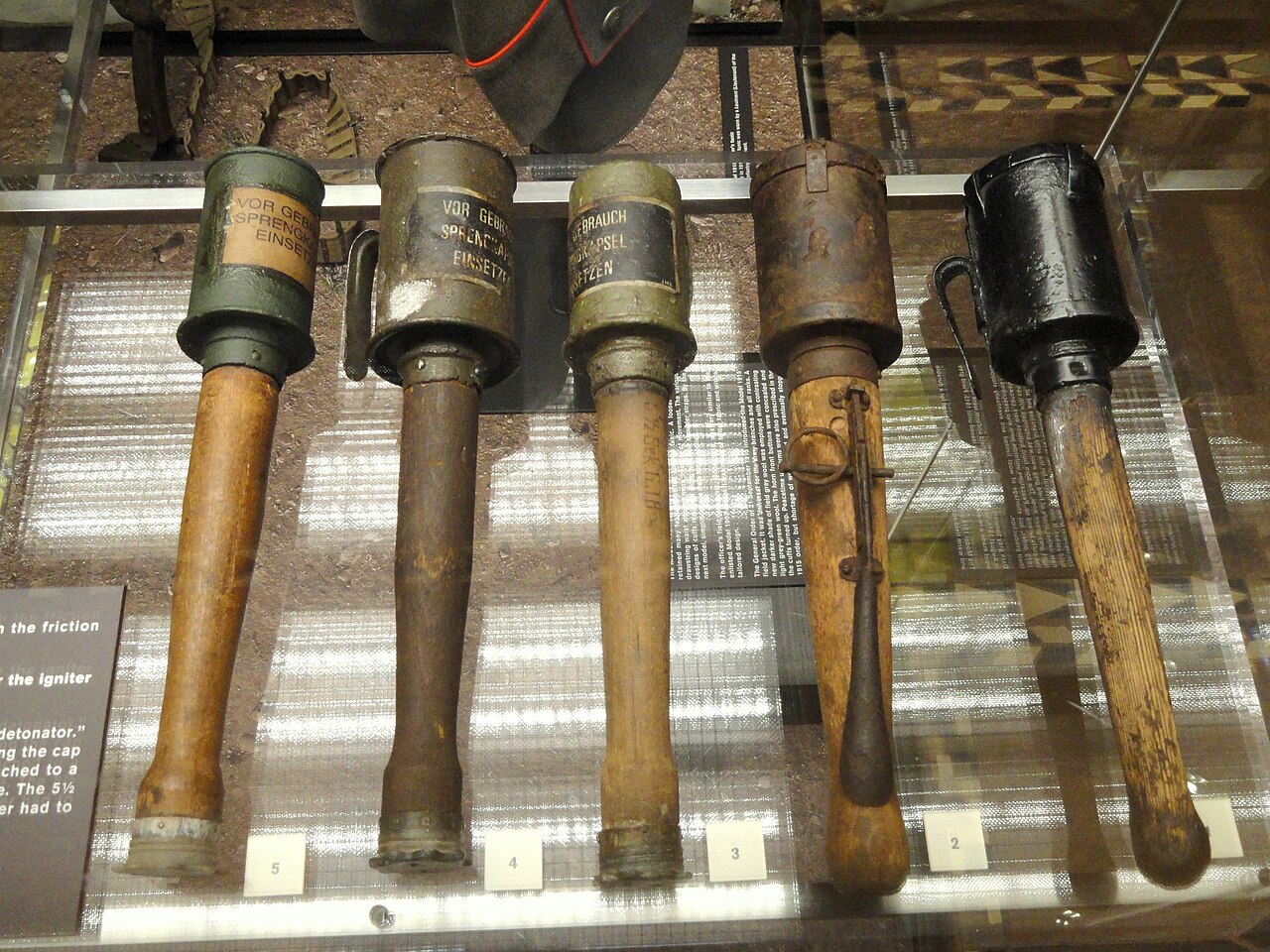 Iconic German stick grenade; often used with fragmentation sleeve when needed.